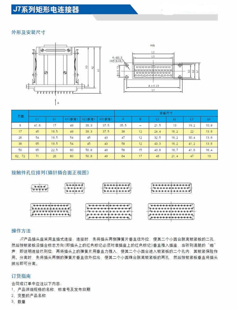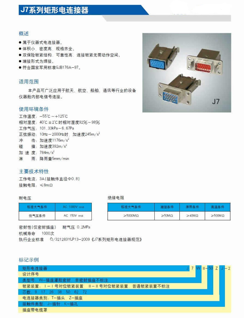 杭州航天電子-J7矩形系列航空插頭,又稱矩形連接器,矩形接插件。適用于各種電子儀器、電氣設(shè)備系統(tǒng)之間的電路連接。該產(chǎn)品為 電子元器件制造廠生產(chǎn)線認(rèn)證合格產(chǎn)品;認(rèn)證采用的國家 標(biāo)準(zhǔn)為GJB 176-86《耐環(huán)境線簧孔矩形電連接器總規(guī)范》。連接方式為直插連接,使用方便,可快速插拔。帶有獨(dú)特的雙重鎖緊機(jī)構(gòu),防雨,外殼屏幕,插座灌膠密封。體積小,重量輕。插孔采用高可靠性能插孔,插拔力小,使用壽命長。