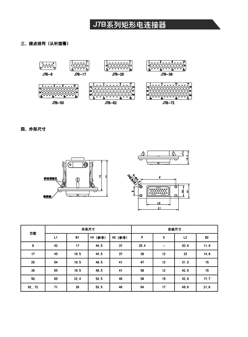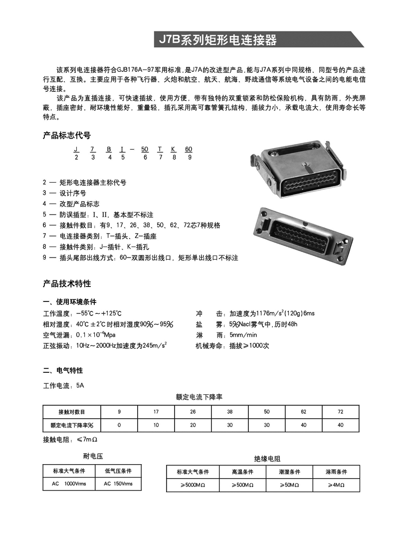 J7B矩形電連接器為直插連接,可快速插拔,使用方便,帶有獨特的雙重鎖緊和防松保險機構(gòu),具有防雨,外殼屏蔽,插座密封,耐環(huán)境好,重量輕,插孔采用高可靠管簧孔結(jié)構(gòu),插拔力小,承載電流大,使用壽命長等特點。