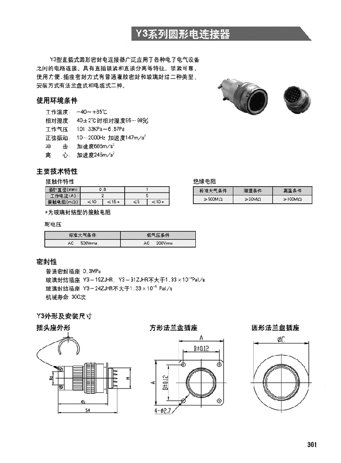Y3型直插式圓形電連接器廣泛應(yīng)用于各種電子電氣設(shè)備之間的電路連接。具有直插鎖緊和直拔分離等特征,鎖緊可靠,使用方便,插座密封方式有普通灌膠密封和玻璃封結(jié)兩種類型,安裝方式有法蘭盤式和電纜式兩種。