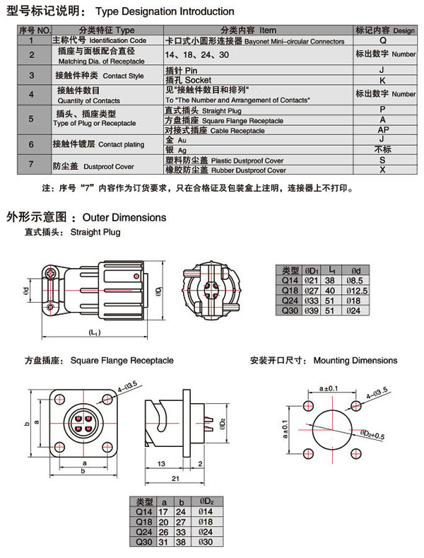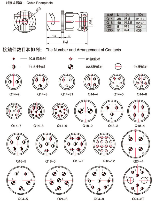 Q型系列圓形電連接器,按電子工業(yè)部標準SJ1744-81制造,產品結構可靠,操作方便。插針、插孔引線采用焊接形式,根據(jù)用戶需要,插頭、插座既可裝針,也可裝孔。該產品具有體積小、重量輕、快速連接、快速分離等特點,被廣泛應用于儀器儀表、電子設備間的電氣連接。