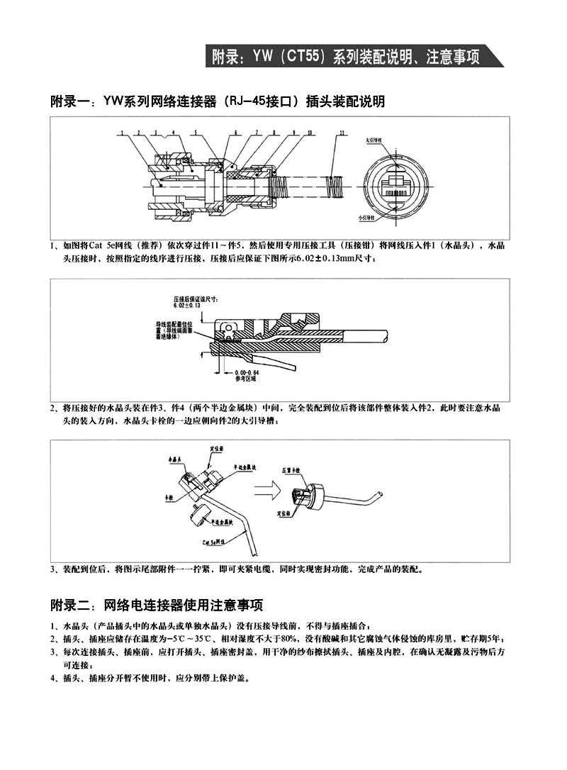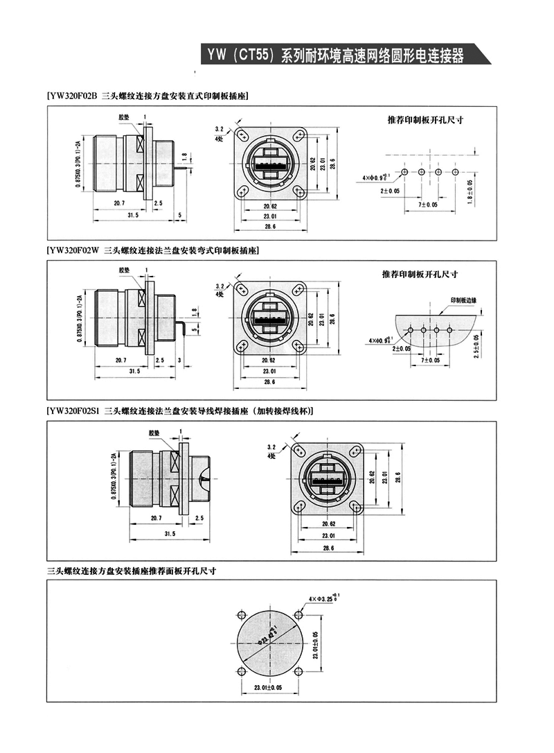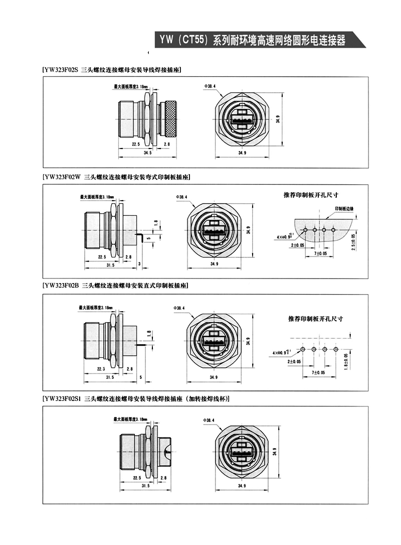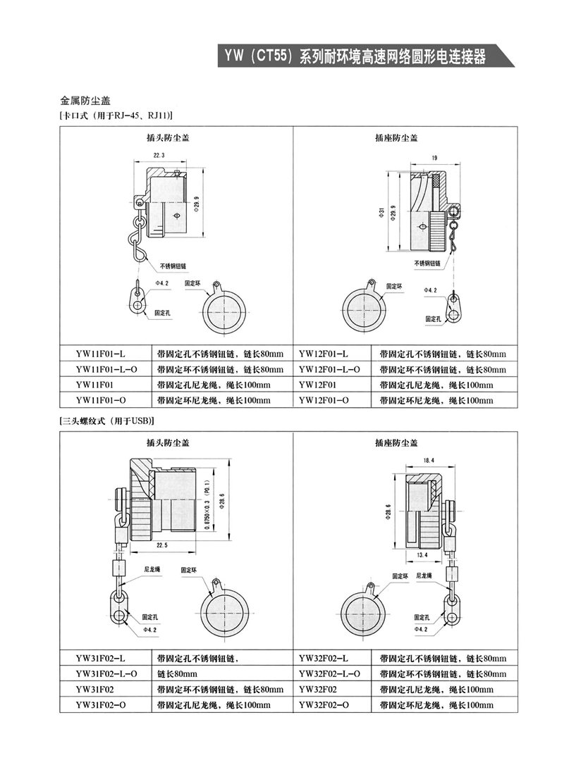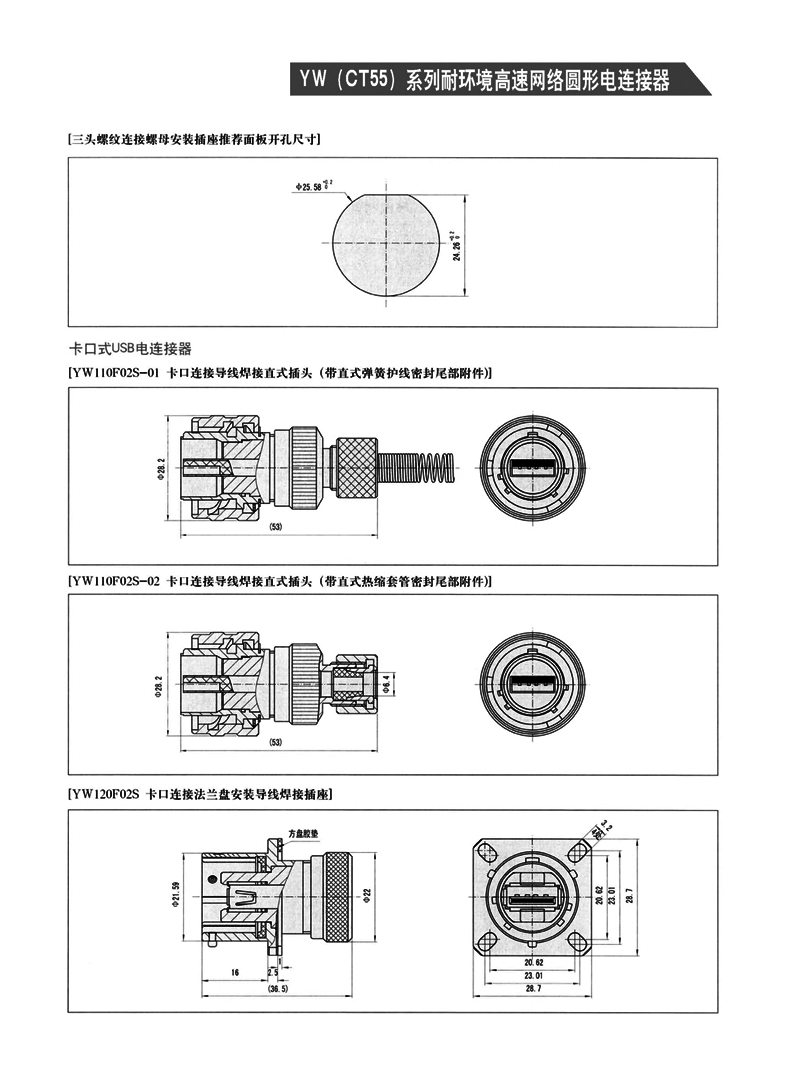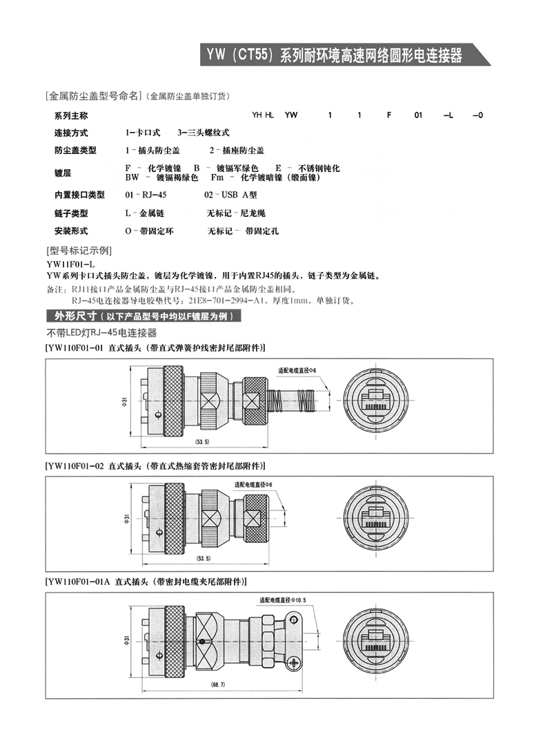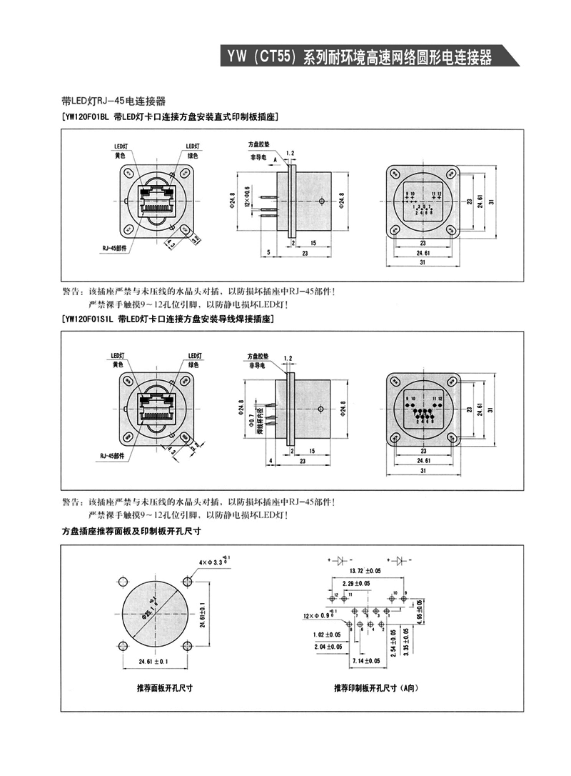YW-RJ45系列耐環(huán)境高速網絡圓形電連接器,是將RJ45網絡數據接口集成于標準圓形連接器中,以提高網絡信息傳輸的可靠性、耐環(huán)境性和抗振動沖擊性,同時也具有連接快速,安裝及接線方便等優(yōu)點。是一種高可靠的新型網口連接器,特別適用于惡劣環(huán)境下的網絡與網絡間、網絡與PC間及PC與數碼設備間的數據傳輸。連接方式:卡口式、三頭螺紋式;端接形式為導線焊接、壓接和基板焊接;插座有端接型和轉接型,轉接形式為單卡口(單螺紋)和雙卡口;接觸件鍍金;接口安裝尺寸符合MIL-C-26482(GJB598)和GJB599的安裝;性能指標符合GJB598和TIA/EIA-568。工作溫度:-55~125℃ 相對濕度:40℃ 90%~95% 工作電壓:150V 工作電流:1.5A 接觸電阻:≤20mΩ 絕緣電阻:≥5000M 耐 壓:1000V(RJ45)振 動:10~2000Hz 147 m/s2 沖 擊: 490 m/s2 機械壽命:500次 衰 減:0.3dB(100MHz) 串 擾:40dB(100MHz) 阻 抗:100Ω 傳輸速率:1000Mbps
