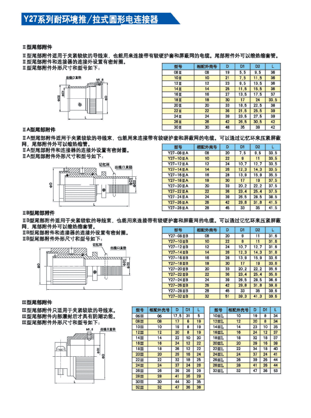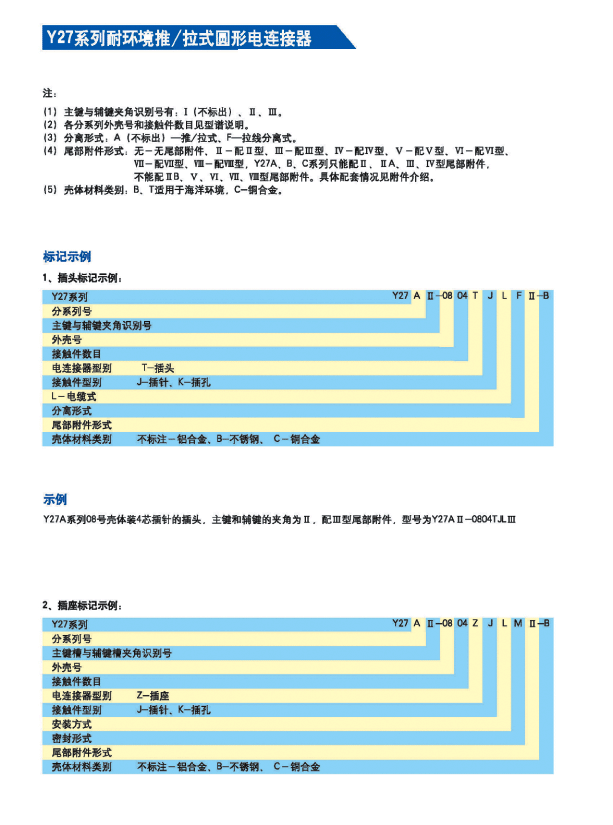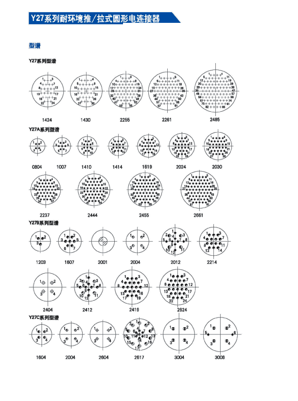 Y27系列耐環(huán)境推/拉式圓形電連接器 ,采用推/拉式鎖緊機(jī)構(gòu),材料為鋁合金、海軍黃銅和不銹鋼三種,共有13種殼體號(hào),1~121等18種芯數(shù),有3~250A等10種電流規(guī)格。Y27A系列電連接器有壓接后松的品種。Y27F、G、H系列電連接器適用于艦船環(huán)境,具有防水密封的性能。Y27H系列電連接器采用雙曲線(xiàn)插孔。符合國(guó)家軍用標(biāo)準(zhǔn)GJB2905-97,性能參照美軍標(biāo)MIL-C-38999。 該系列航空電連接器連接和分離方便、快捷,適用于盲目插合或其他插合情況,具有抗振動(dòng)、防鹽霧、防電磁干擾的性能,有防塵、防雨及氣體密封等品種。Y27系列電連接器廣泛應(yīng)用于航天、航空、船舶、通訊等領(lǐng)域。