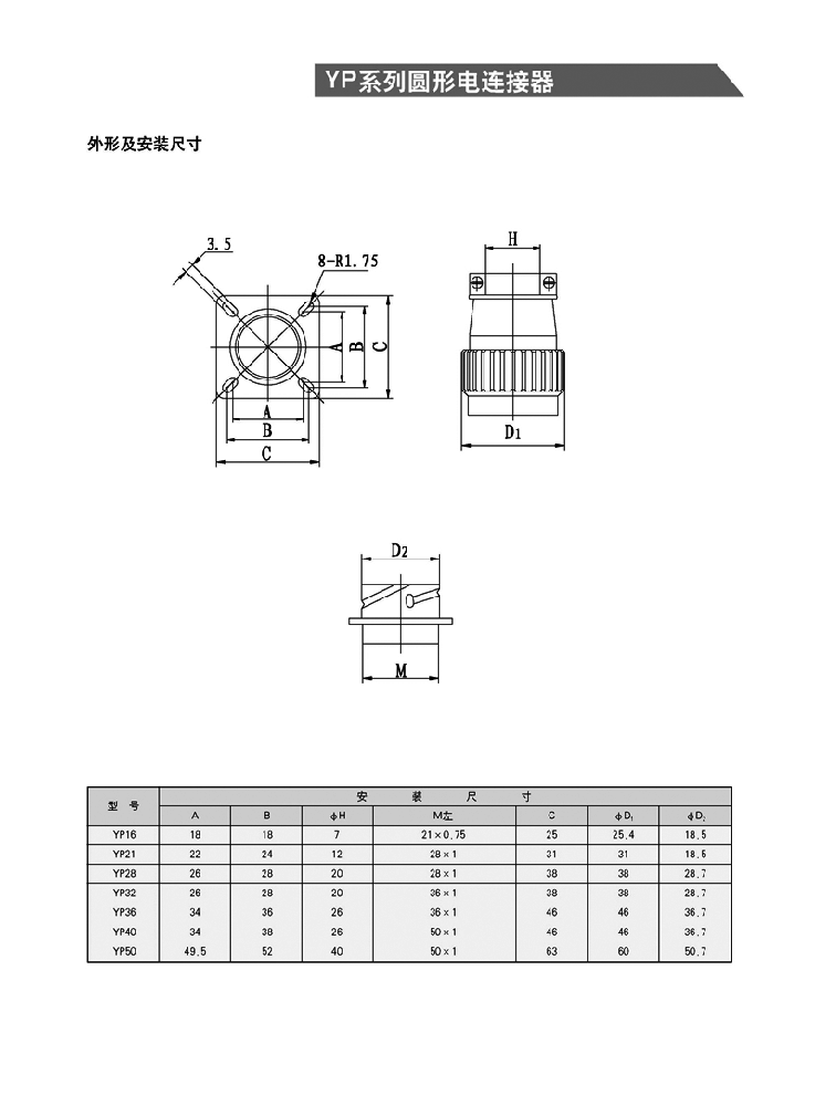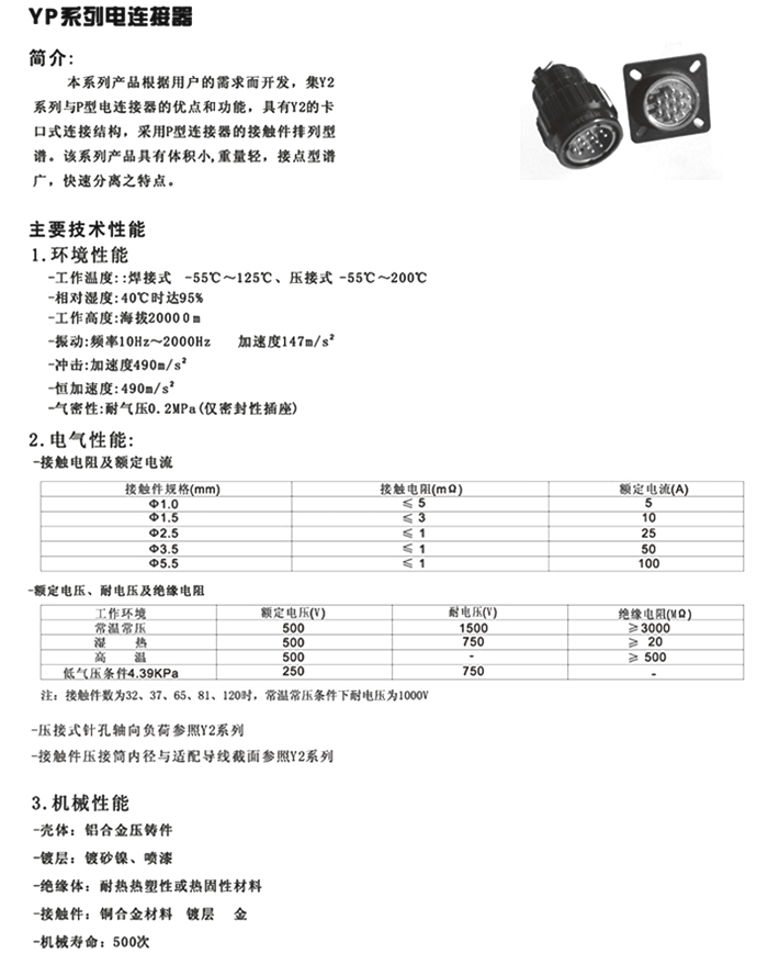 YP系列 圓形電連接器(航空插頭)簡(jiǎn)介:根據(jù)用戶的需求而開(kāi)發(fā),集Y2系列與P型電連接器的優(yōu)點(diǎn)和功能,具有Y2的卡口式連接結(jié)構(gòu),采用P型連接器的接觸件排列型譜。該系列產(chǎn)品具有體積小,重量輕,接點(diǎn)型譜廣,快速分離之特點(diǎn)。