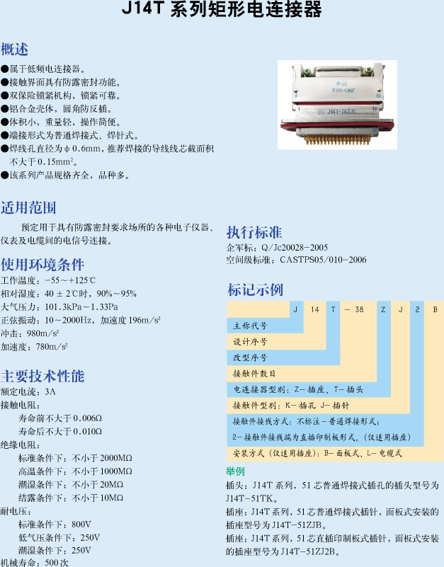 J14T矩形電連接器執(zhí)行Q/HD20037-2007詳細(xì)規(guī)范,屬于推拉式電連接器,規(guī)格齊全,有9,15,27,36,51等五種芯數(shù),端接形式為導(dǎo)線壓接式,頭座均有線纜引出,廣泛應(yīng)用于航天、航空、兵器、艦船、通訊、計(jì)算機(jī)等行業(yè)的設(shè)備儀器艙內(nèi)部電信號連接。