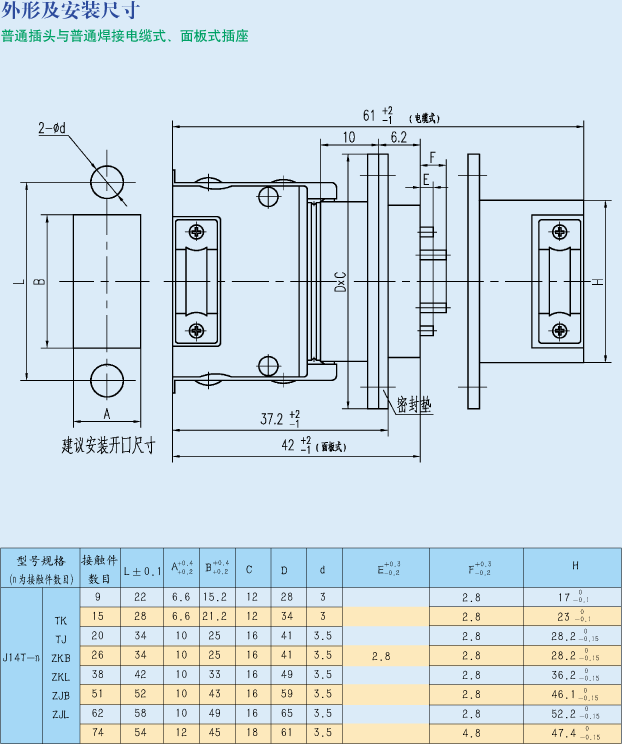 示例:J14T系列,接觸件數(shù)目為15、產(chǎn)品型別插座,接觸件型別插針,面板式安裝的電連接器標(biāo)識(shí)為:J14F-15ZJB.