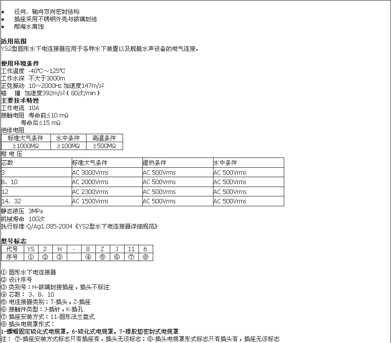 8芯深水電連接器 ,內(nèi)外全部選用不銹鋼材料,插座采用玻璃封結(jié)特殊工藝,耐海水腐蝕。連接方式為螺紋連接,里面有雙層密封設(shè)計(jì),使用方便,可快速插拔,殼體為高強(qiáng)度不銹鋼(316)、具有抗強(qiáng)腐蝕(酸、堿)、寬溫度環(huán)境和高壓特點(diǎn).由于產(chǎn)品的特殊性,客戶要提前訂購。 廣泛應(yīng)用于深??碧?、深水?dāng)z像、水下作業(yè)的各種電氣設(shè)備、水下機(jī)器人。