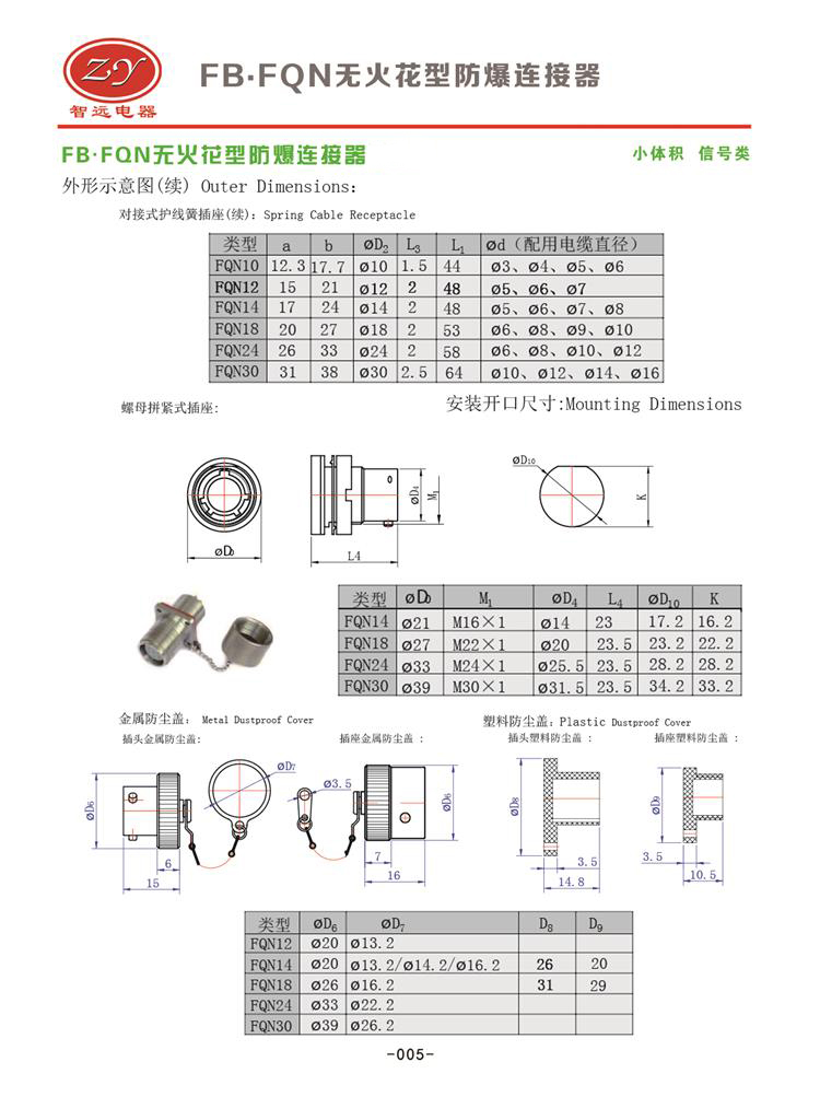 FB.Y50X-1208對接式無火花型防爆插頭插座,可以接8根線,額定電流5A,螺紋連接,表面氧化著色,美觀大方,抗腐蝕性能強,尾部雙重電纜保護。材料有鋁、銅、不銹鋼選用。插座有固定式和移動式兩種。