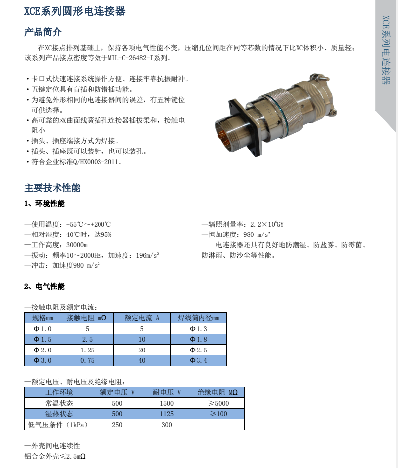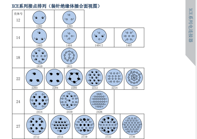 XCE航空電連接器在XC接點(diǎn)排列基礎(chǔ)上,保持各項(xiàng)電氣性能不變,壓縮孔位間距,同等情況下比XC型體積小,重量輕,接點(diǎn)密度等效于GJB2889標(biāo)準(zhǔn),相當(dāng)于MIL-C-16482系列,有五種鍵位防盲插和防錯(cuò)插功能。插頭和插座端接形式焊接。