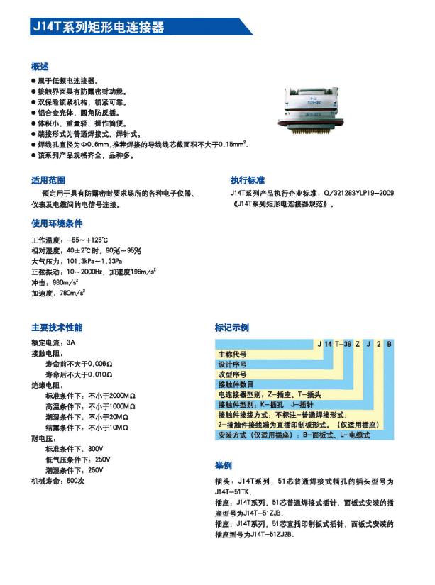 鄭州航天電子-J14T系列矩形電連接器,屬于低頻連接器,鋁合金殼體,圓角防反插,端接形式為普通焊接式,導(dǎo)線焊線截面積不大于0.15mm2, 雙保險鎖緊機構(gòu),具有防露密封功能。