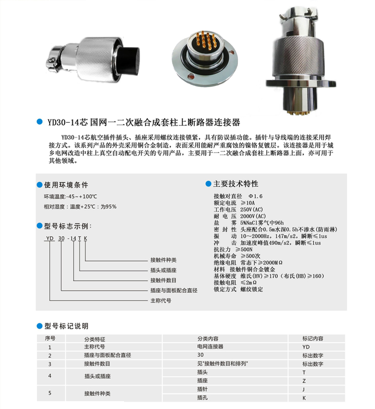 14芯FTU/TDU國家電網(wǎng)連接器,電流大,額定電流10A,接觸可靠,插頭與插座螺紋連接,防水防層,外殼銅合金鍍鉻,或者不銹鋼材料,主要用于電力系統(tǒng)高壓真空設備之間的電路連接。