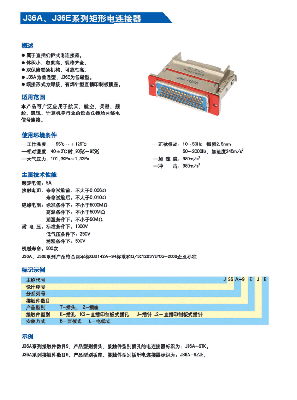 J36A,E矩形航空接插件,執(zhí)行Q/HD20038-2007詳細規(guī)范,屬于儀器式電連接器。具有體積小、密度高、規(guī)格齊全、雙保險鎖緊結(jié)構(gòu)、可靠性高等優(yōu)點,端接形式為焊接式和直插印制板式。廣泛應用于航天、航空、兵器、艦船、通訊、計算機等行業(yè)的設備儀器艙內(nèi)部電信號連接。