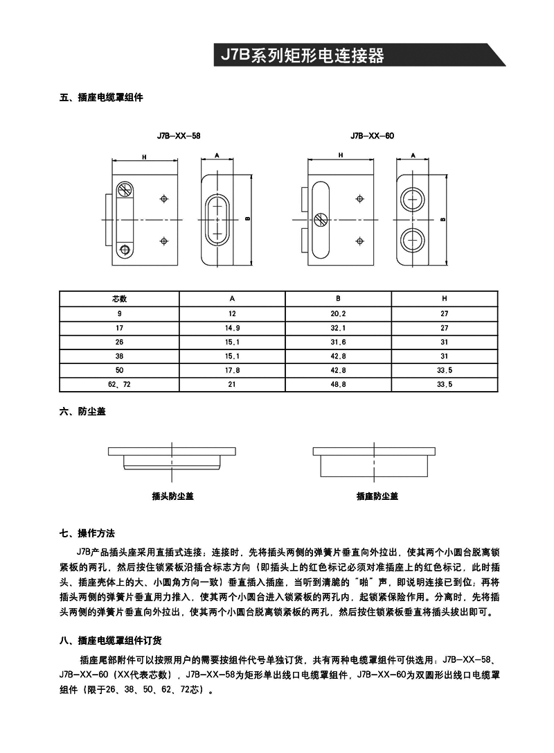 J7B矩形電連接器為直插連接,可快速插拔,使用方便,帶有獨特的雙重鎖緊和防松保險機構(gòu),具有防雨,外殼屏蔽,插座密封,耐環(huán)境好,重量輕,插孔采用高可靠管簧孔結(jié)構(gòu),插拔力小,承載電流大,使用壽命長等特點。