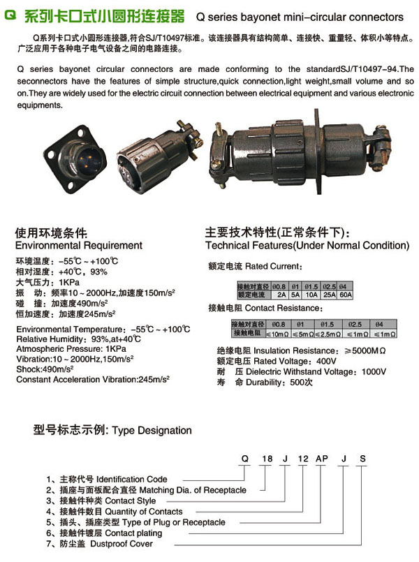 Q型系列圓形電連接器,按電子工業(yè)部標準SJ1744-81制造,產品結構可靠,操作方便。插針、插孔引線采用焊接形式,根據(jù)用戶需要,插頭、插座既可裝針,也可裝孔。該產品具有體積小、重量輕、快速連接、快速分離等特點,被廣泛應用于儀器儀表、電子設備間的電氣連接。