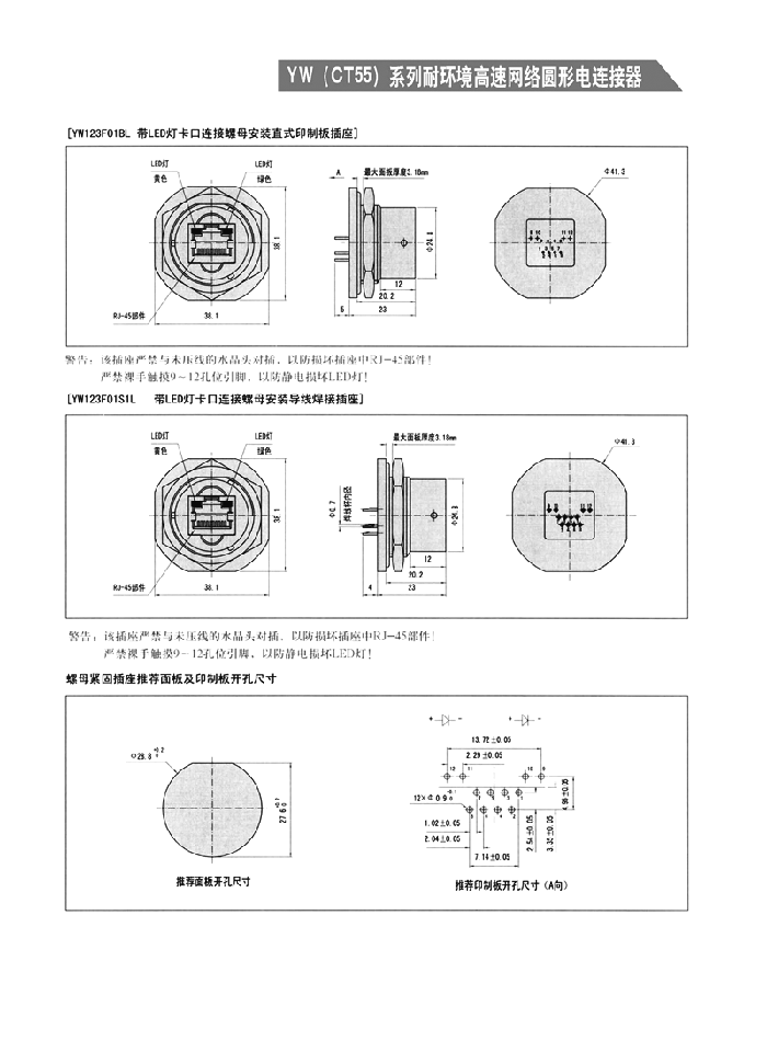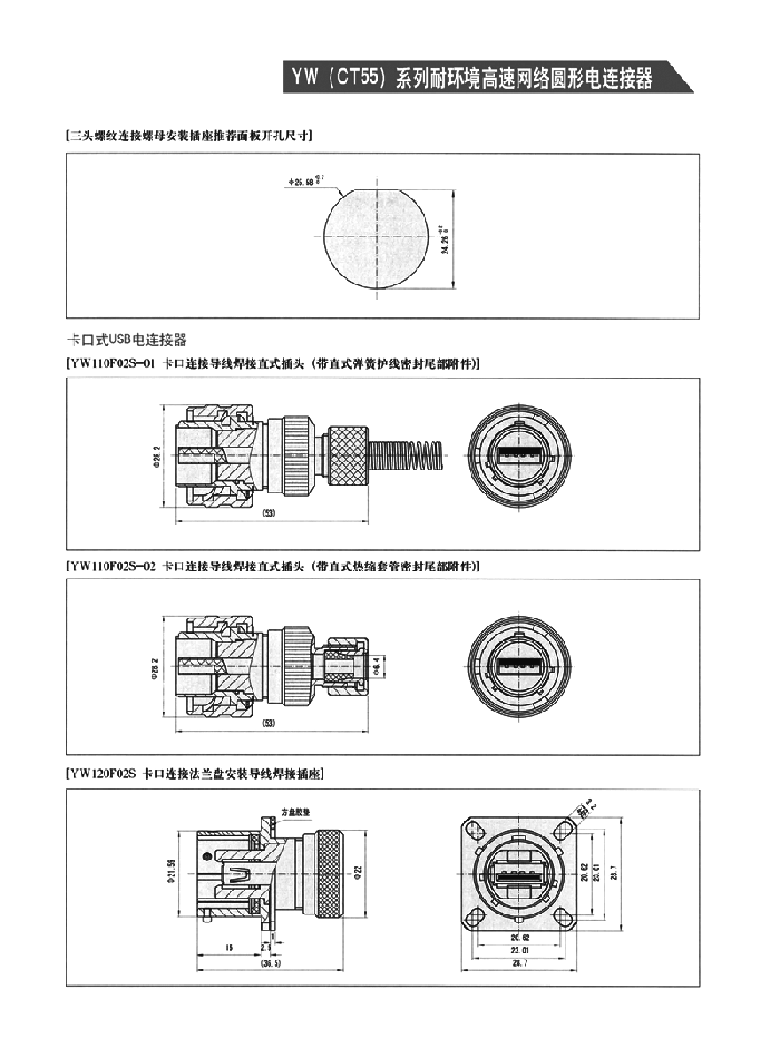 YW系列耐環(huán)境高速網(wǎng)絡(luò)圓形電連接器,是將USB網(wǎng)絡(luò)數(shù)據(jù)接口集成于標(biāo)準(zhǔn)圓形連接器中,以提高網(wǎng)絡(luò)信息傳輸?shù)目煽啃浴⒛铜h(huán)境性和抗振動(dòng)沖擊性,同時(shí)也具有連接快速,安裝及接線方便等優(yōu)點(diǎn)。是一種高可靠的新型網(wǎng)絡(luò)連接器,特別適用于惡劣環(huán)境下的網(wǎng)絡(luò)與網(wǎng)絡(luò)間、網(wǎng)絡(luò)與PC間及PC與數(shù)碼設(shè)備間的數(shù)據(jù)傳輸。