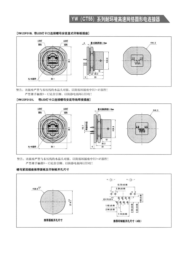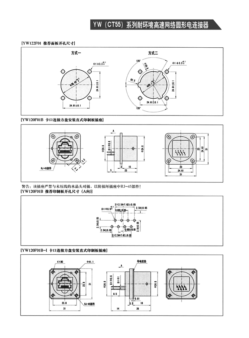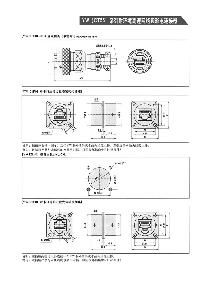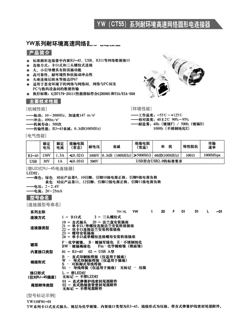YW-RJ45系列耐環(huán)境高速網絡圓形電連接器,是將RJ45網絡數據接口集成于標準圓形連接器中,以提高網絡信息傳輸的可靠性、耐環(huán)境性和抗振動沖擊性,同時也具有連接快速,安裝及接線方便等優(yōu)點。是一種高可靠的新型網口連接器,特別適用于惡劣環(huán)境下的網絡與網絡間、網絡與PC間及PC與數碼設備間的數據傳輸。連接方式:卡口式、三頭螺紋式;端接形式為導線焊接、壓接和基板焊接;插座有端接型和轉接型,轉接形式為單卡口(單螺紋)和雙卡口;接觸件鍍金;接口安裝尺寸符合MIL-C-26482(GJB598)和GJB599的安裝;性能指標符合GJB598和TIA/EIA-568。工作溫度:-55~125℃ 相對濕度:40℃ 90%~95% 工作電壓:150V 工作電流:1.5A 接觸電阻:≤20mΩ 絕緣電阻:≥5000M 耐 壓:1000V(RJ45)振 動:10~2000Hz 147 m/s2 沖 擊: 490 m/s2 機械壽命:500次 衰 減:0.3dB(100MHz) 串 擾:40dB(100MHz) 阻 抗:100Ω 傳輸速率:1000Mbps