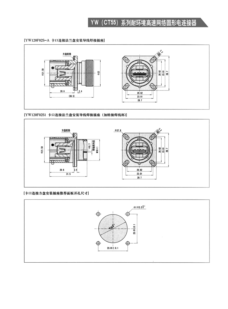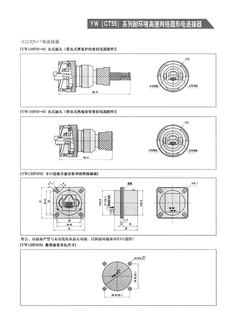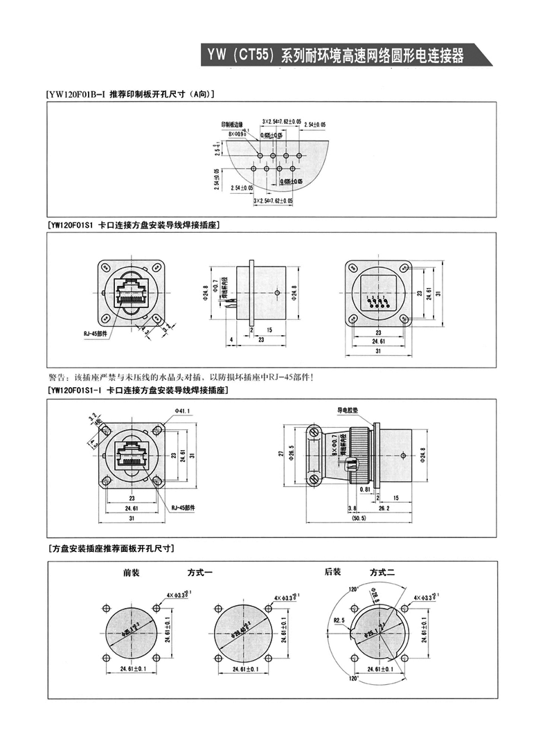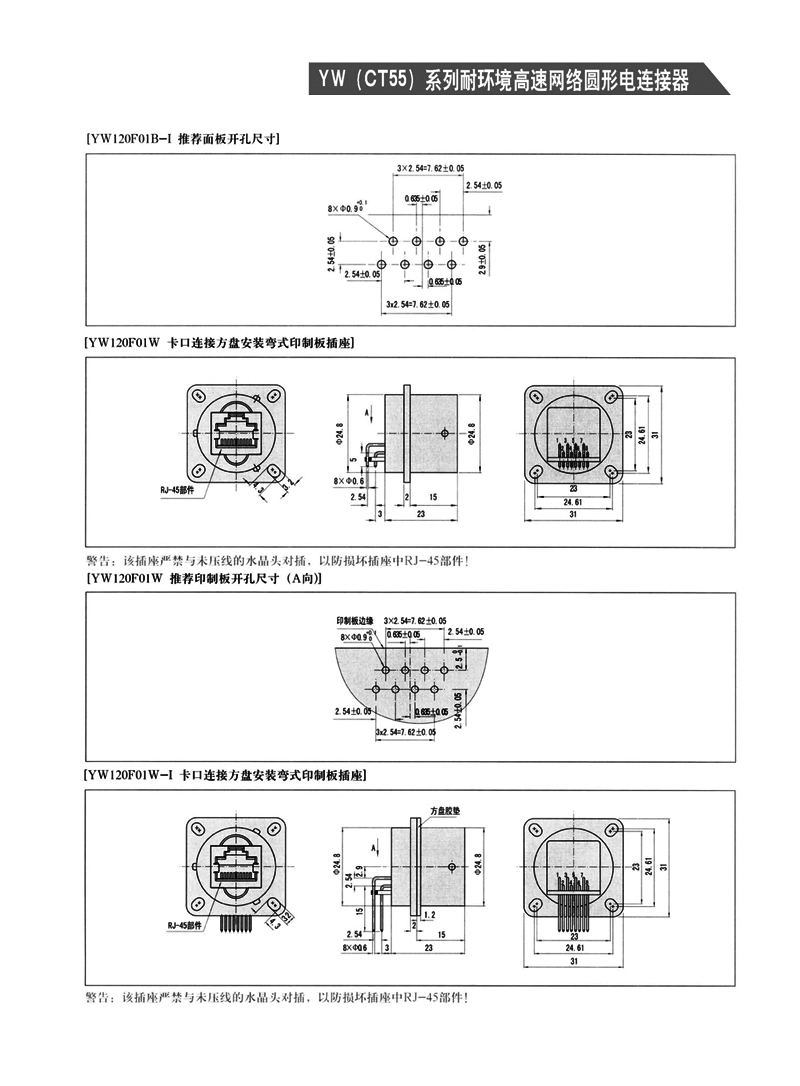 YW-RJ45系列耐環(huán)境高速網絡圓形電連接器,是將RJ45網絡數據接口集成于標準圓形連接器中,以提高網絡信息傳輸的可靠性、耐環(huán)境性和抗振動沖擊性,同時也具有連接快速,安裝及接線方便等優(yōu)點。是一種高可靠的新型網口連接器,特別適用于惡劣環(huán)境下的網絡與網絡間、網絡與PC間及PC與數碼設備間的數據傳輸。連接方式:卡口式、三頭螺紋式;端接形式為導線焊接、壓接和基板焊接;插座有端接型和轉接型,轉接形式為單卡口(單螺紋)和雙卡口;接觸件鍍金;接口安裝尺寸符合MIL-C-26482(GJB598)和GJB599的安裝;性能指標符合GJB598和TIA/EIA-568。工作溫度:-55~125℃ 相對濕度:40℃ 90%~95% 工作電壓:150V 工作電流:1.5A 接觸電阻:≤20mΩ 絕緣電阻:≥5000M 耐 壓:1000V(RJ45)振 動:10~2000Hz 147 m/s2 沖 擊: 490 m/s2 機械壽命:500次 衰 減:0.3dB(100MHz) 串 擾:40dB(100MHz) 阻 抗:100Ω 傳輸速率:1000Mbps