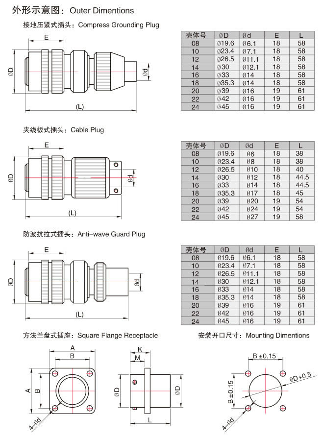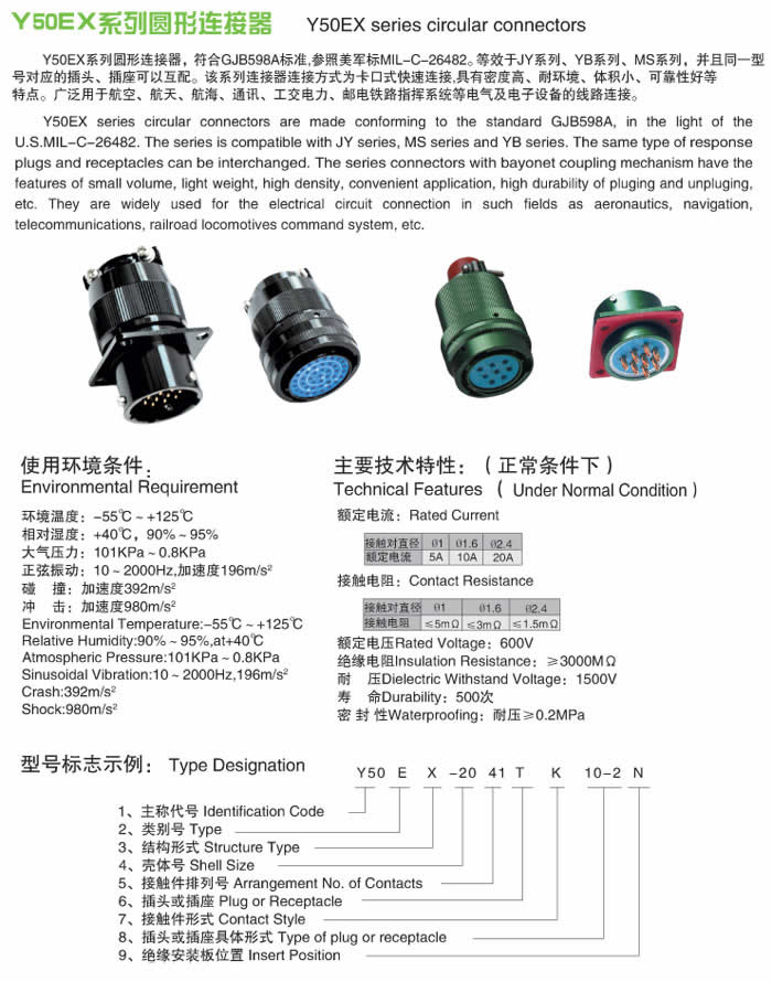 Y50EX系列圓形電連接器,產品采用卡口式連接系統,具有快速連接和快速分離,體積小、重量輕等特點。插頭有多種電纜安裝形式,即:電纜夾線板式、簡易封裝式、接地壓緊式、防波抗拉式、彎頭護線式、電纜話筒式和彈簧護線式等。電纜出線口備有各種規(guī)格不同的密封橡膠護線縣,能與電纜線緊密配接,增強了電纜線和連接器插頭的防雨、防水、防塵密封性和抗拉性能。接觸件焊接,殼體有屏蔽和非屏蔽以及多種鍍層可選,插座有一般密封和玻璃燒結密封等類觀,以適用不同的工作環(huán)境。