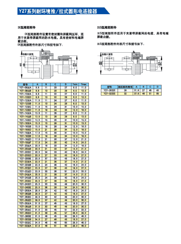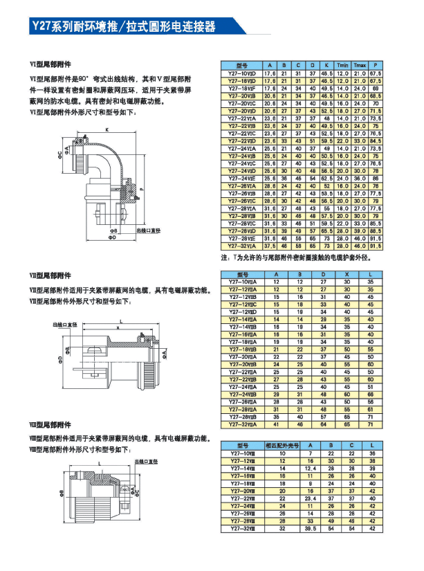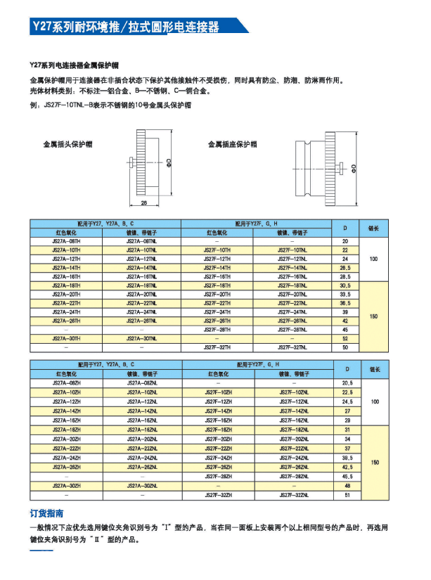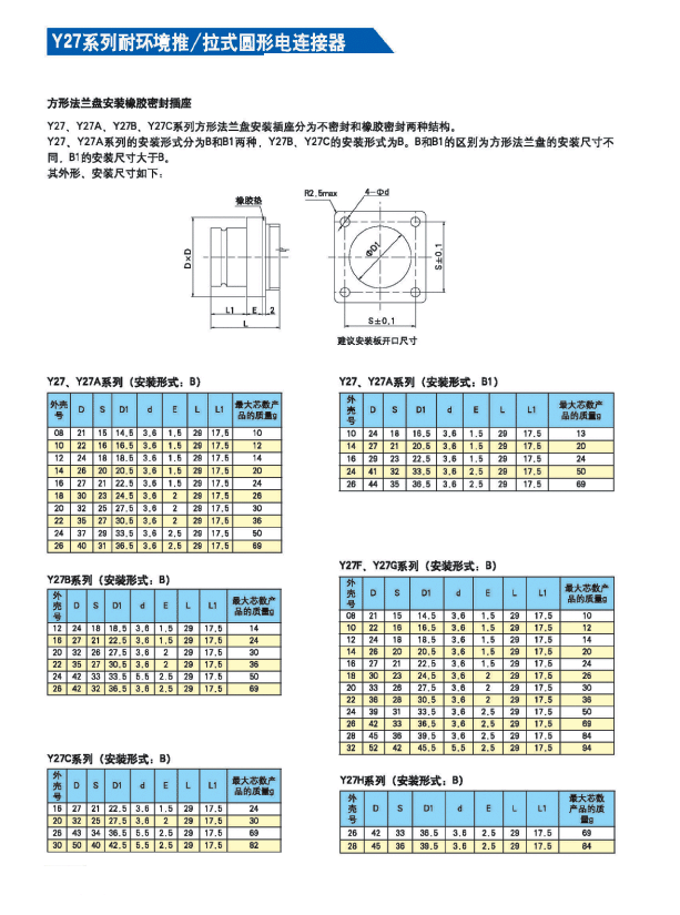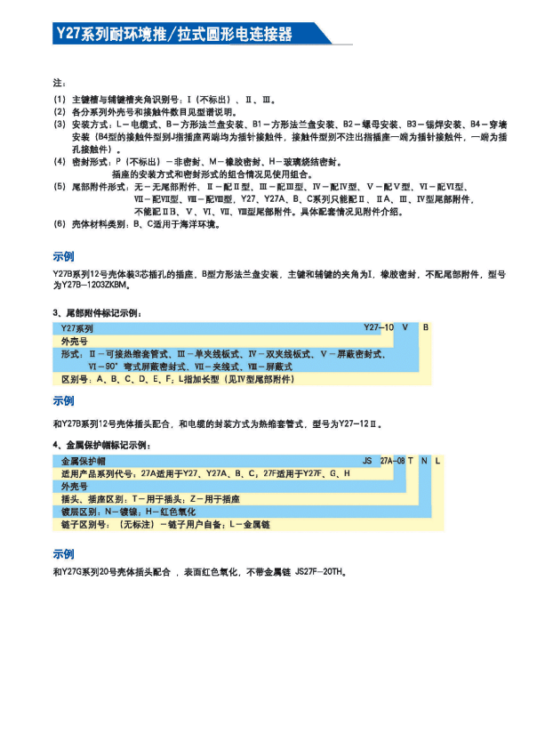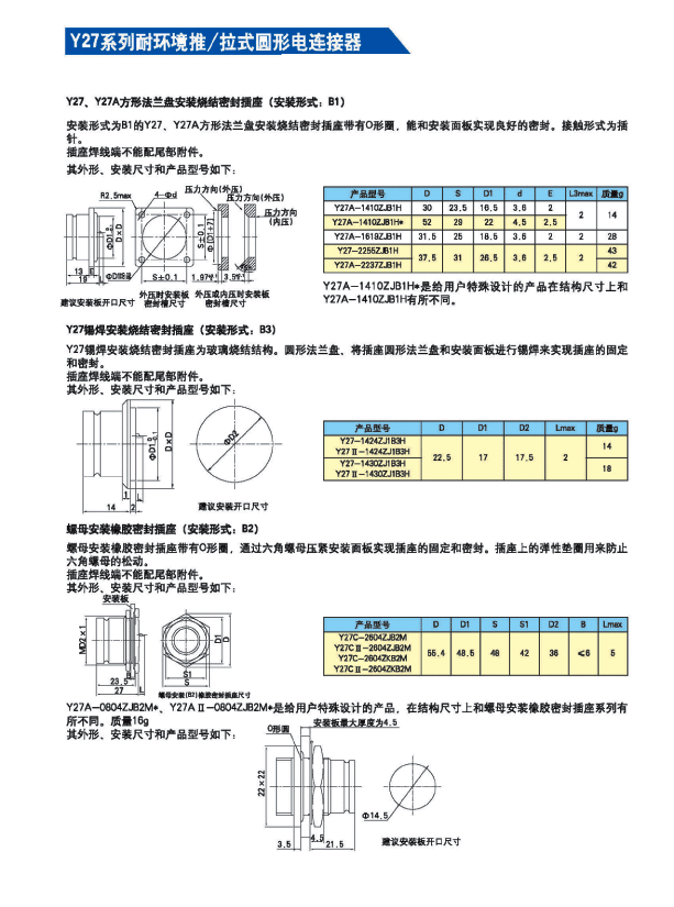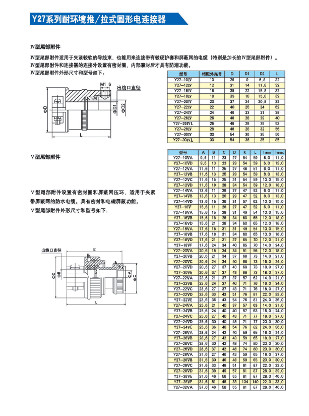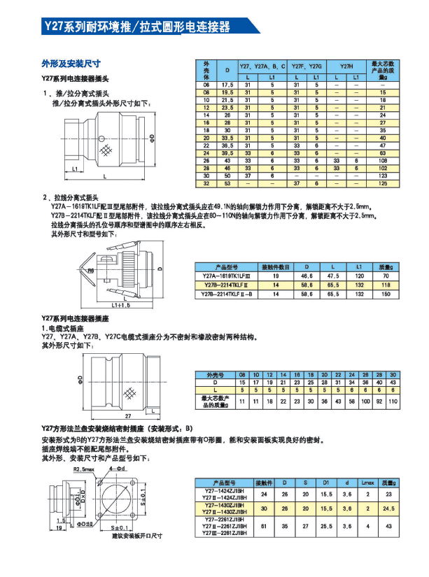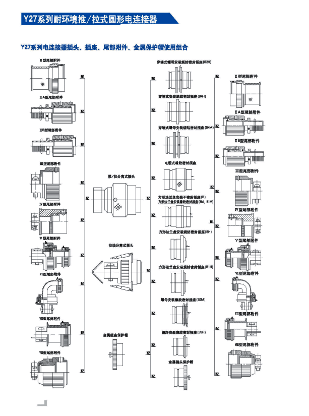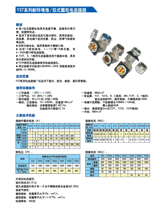 Y27系列耐環(huán)境推/拉式圓形電連接器 ,采用推/拉式鎖緊機(jī)構(gòu),材料為鋁合金、海軍黃銅和不銹鋼三種,共有13種殼體號(hào),1~121等18種芯數(shù),有3~250A等10種電流規(guī)格。Y27A系列電連接器有壓接后松的品種。Y27F、G、H系列電連接器適用于艦船環(huán)境,具有防水密封的性能。Y27H系列電連接器采用雙曲線(xiàn)插孔。符合國(guó)家軍用標(biāo)準(zhǔn)GJB2905-97,性能參照美軍標(biāo)MIL-C-38999。 該系列航空電連接器連接和分離方便、快捷,適用于盲目插合或其他插合情況,具有抗振動(dòng)、防鹽霧、防電磁干擾的性能,有防塵、防雨及氣體密封等品種。Y27系列電連接器廣泛應(yīng)用于航天、航空、船舶、通訊等領(lǐng)域。