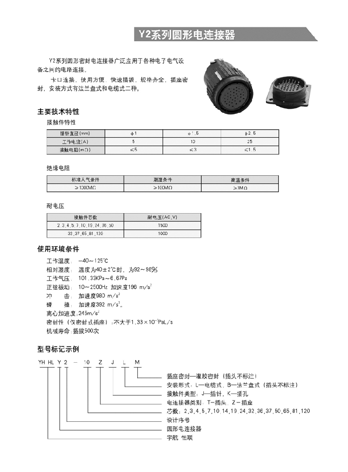 Y2系列軍用級圓形航空插頭,是老式“P”型電連接器(航空插頭)的換代產(chǎn)品,具有體積小、重量輕、使用方便、耐插拔,導電性能佳,密封性好的特點。廣泛適用于各類電器設備、儀器、儀表之間的線路連接。