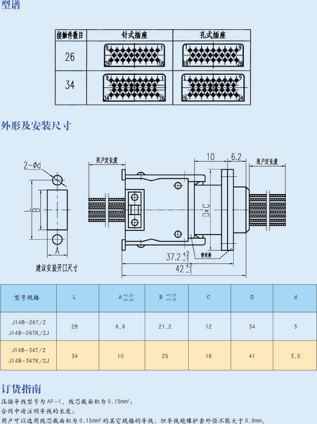 J14B系列矩形連接器 是 在J14A系列矩形電連接器外殼的基礎(chǔ)上,增加了接觸件的密度和防雨功能。帶電纜,端接形式為壓接,電纜規(guī)格和長度由用戶確定。