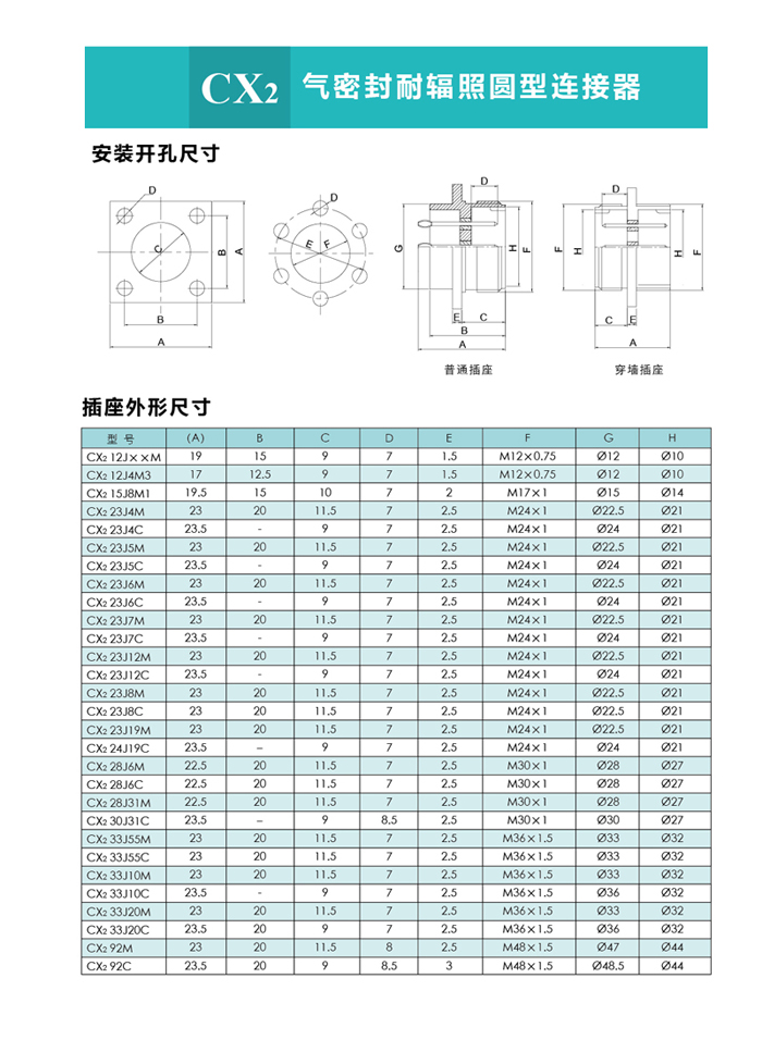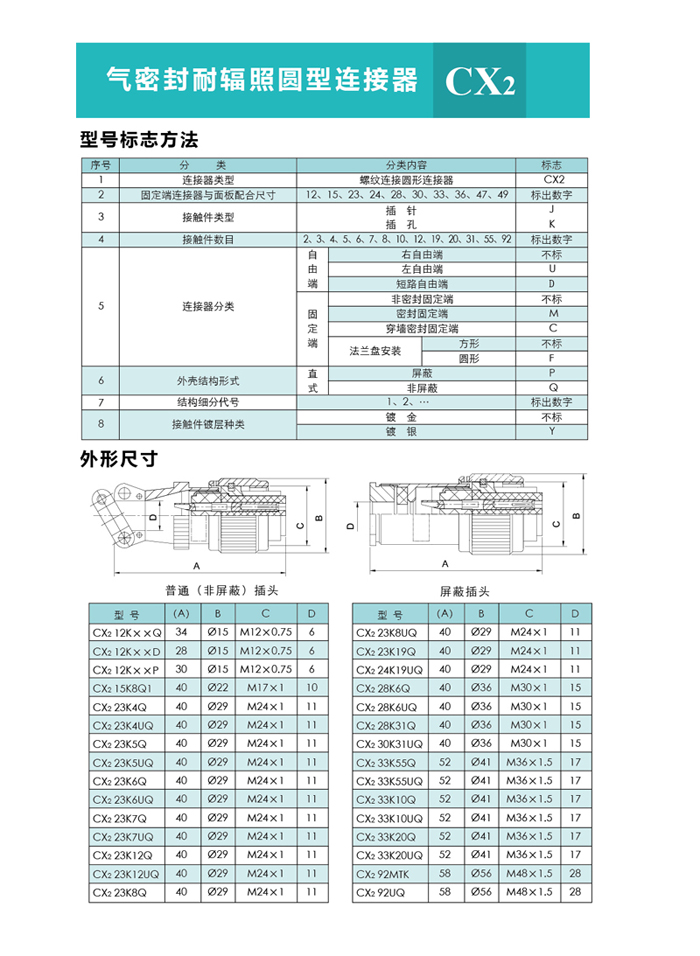 CX2系列氣密封圓形連接器,主要技術(shù)參數(shù)非等效采用美軍標(biāo)MIL-C-26482G。廣泛應(yīng)用于各種電子儀器、密封容器的子設(shè)備與電源之間的電路連接。該系列連接器的連接方式為螺紋鎖緊連接,使用方便。插座采用玻璃燒結(jié)工藝,氣密性好。