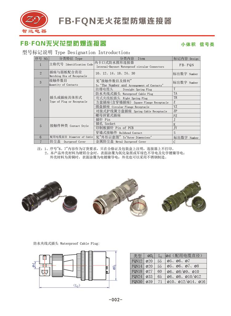 FB.Y50X-1208對接式無火花型防爆插頭插座,可以接8根線,額定電流5A,螺紋連接,表面氧化著色,美觀大方,抗腐蝕性能強,尾部雙重電纜保護。材料有鋁、銅、不銹鋼選用。插座有固定式和移動式兩種。
